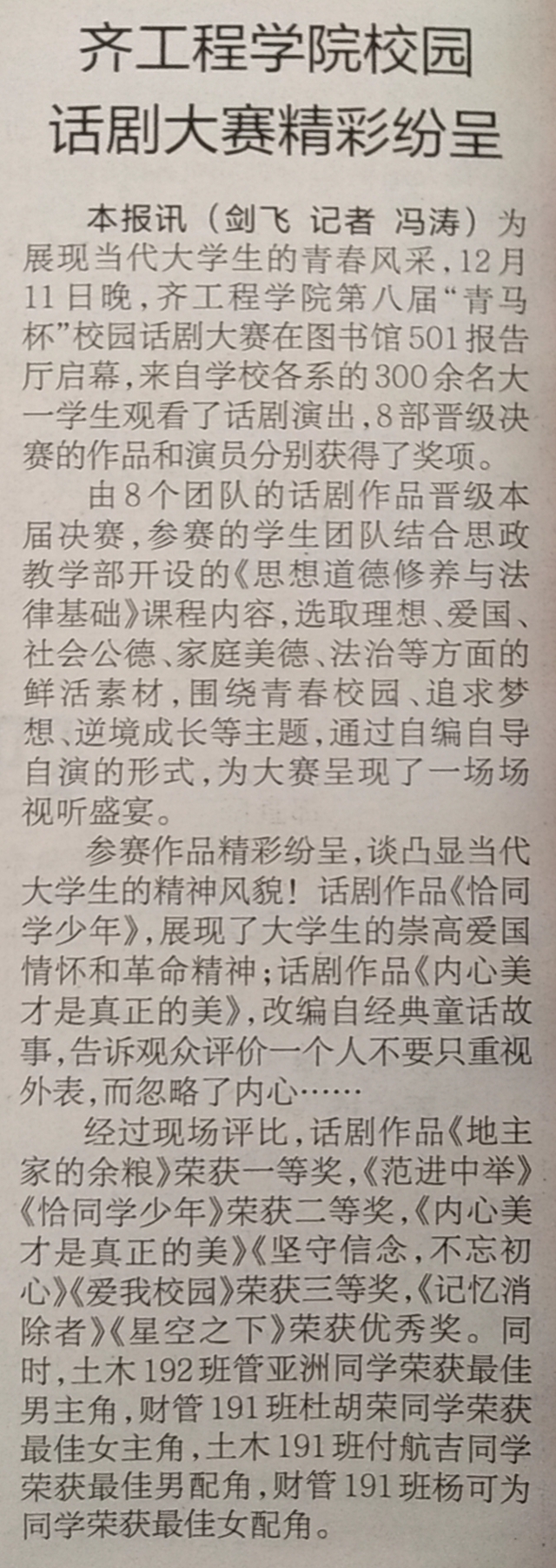 鹤城晚报:齐工程学院校园话剧大赛精彩纷呈