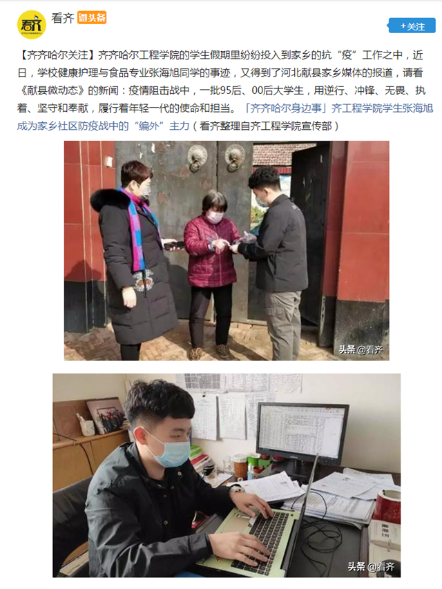 看齐微头条:学校健康护理与食品专业张海旭同学的事迹得到了河北献县家乡媒体的报道