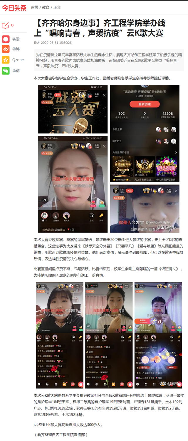 今日头条《齐齐哈尔身边事》:齐工程学院举办线上“唱响青春,声援抗疫”云K歌大赛