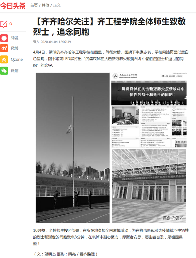 今日头条《齐齐哈尔关注》:齐工程学院全体师生致敬烈士,追念同胞