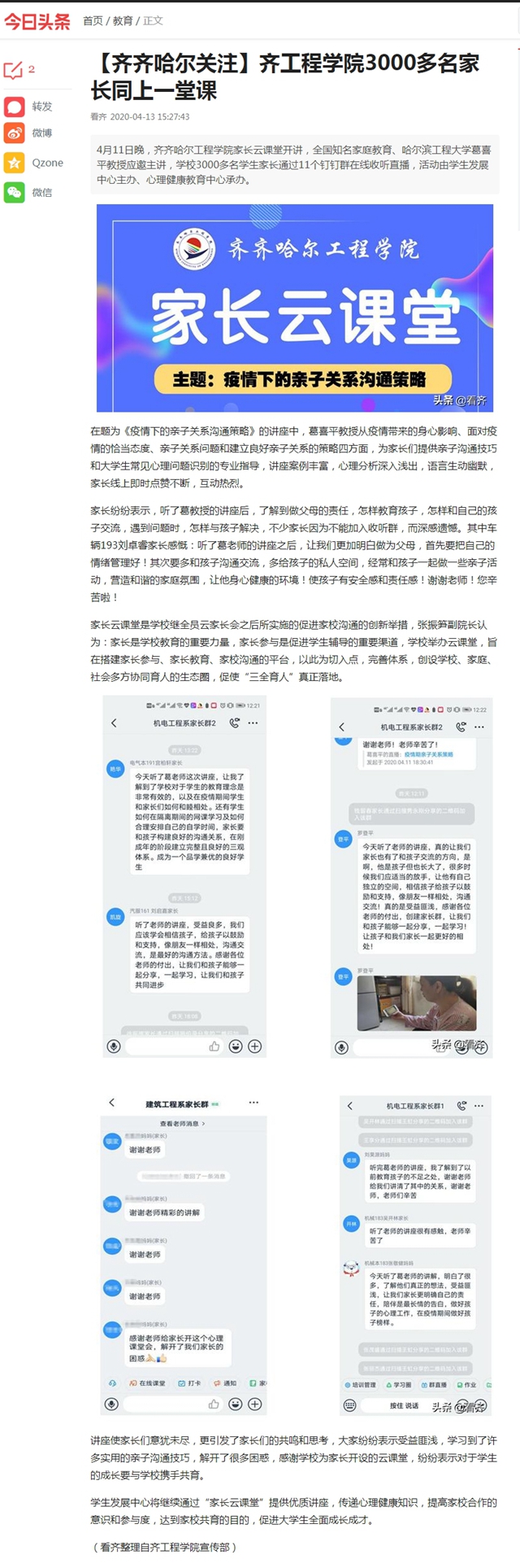 今日头条《齐齐哈尔关注》:齐工程学院3000多名家长同上一堂课