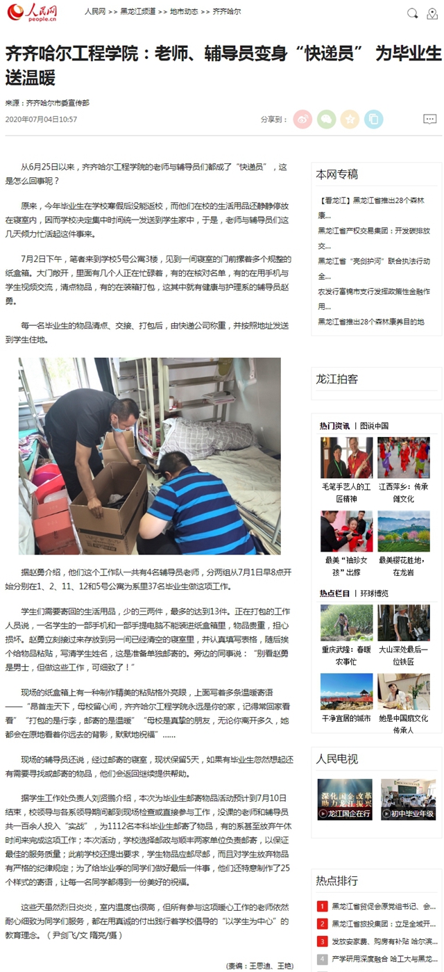 人民网:齐齐哈尔工程学院:老师、辅导员变身“快递员” 为毕业生送温暖