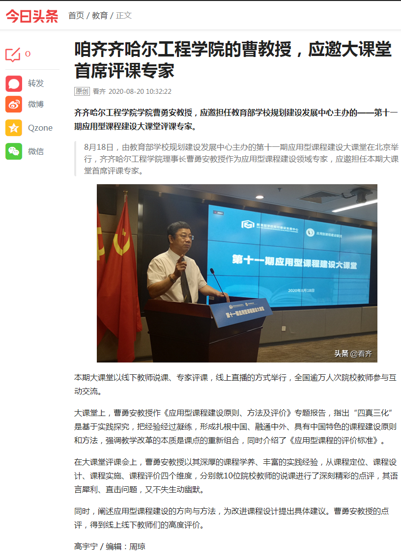 今日头条:咱齐齐哈尔工程学院的曹教授,应邀大课堂首席评课专家