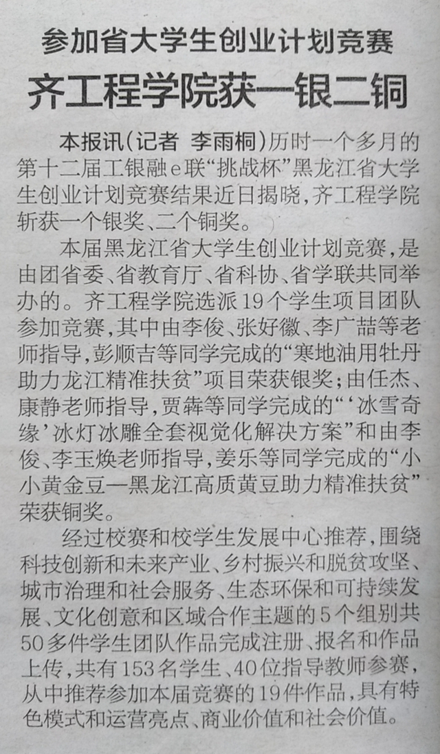 鹤城晚报:参加省大学生创业计划竞赛 齐工程学院获一银二铜