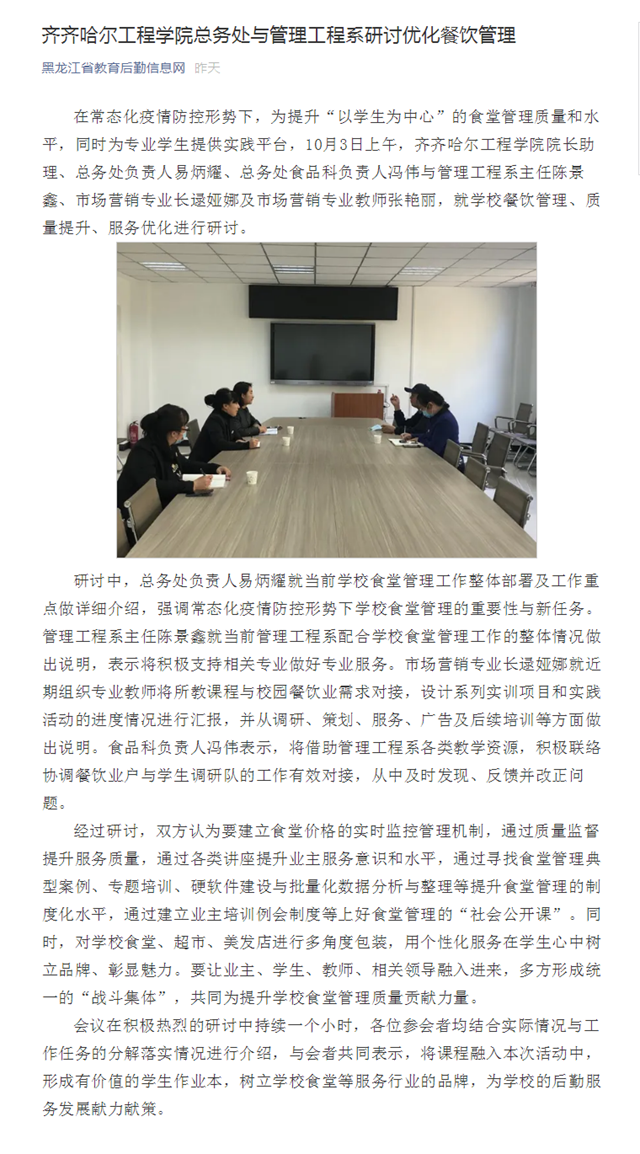 黑龙江省教育后勤信息网:齐齐哈尔工程学院总务处与管理工程系研讨优化餐饮管理