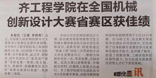 鹤城晚报:齐工程学院在全国机械创新设计大赛省赛区获佳绩