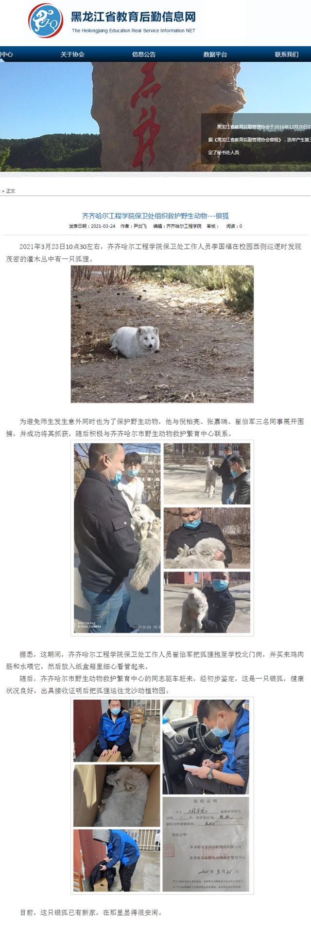 黑龙江省教育后勤信息网:齐齐哈尔工程学院保卫处组织救护野生动物---银狐