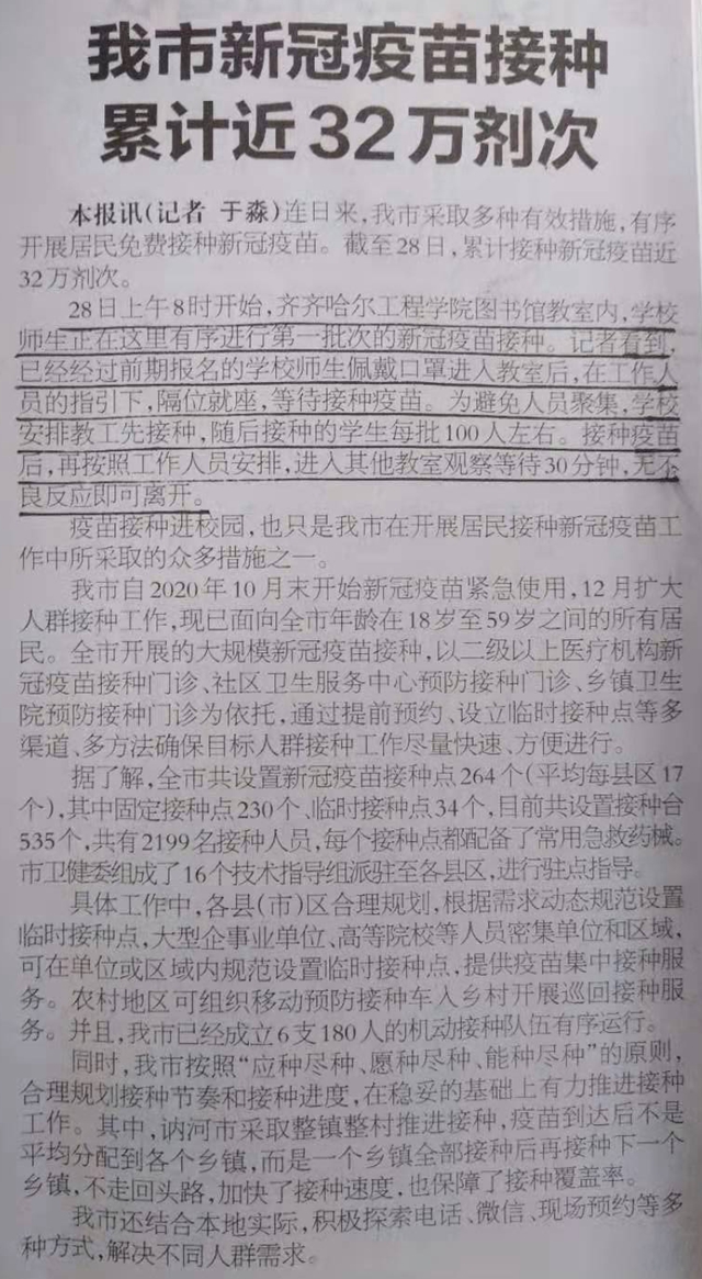 齐齐哈尔日报:我市新冠疫苗接种累计近32万剂次