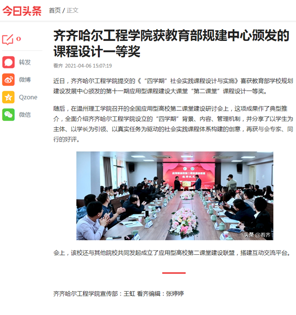 今日头条:齐齐哈尔工程学院获教育部规建中心颁发的课程设计一等奖