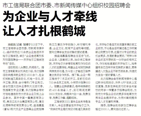 鹤城晚报报道“企业走进高校系列校园招聘会——齐齐哈尔工程学院专场”活动