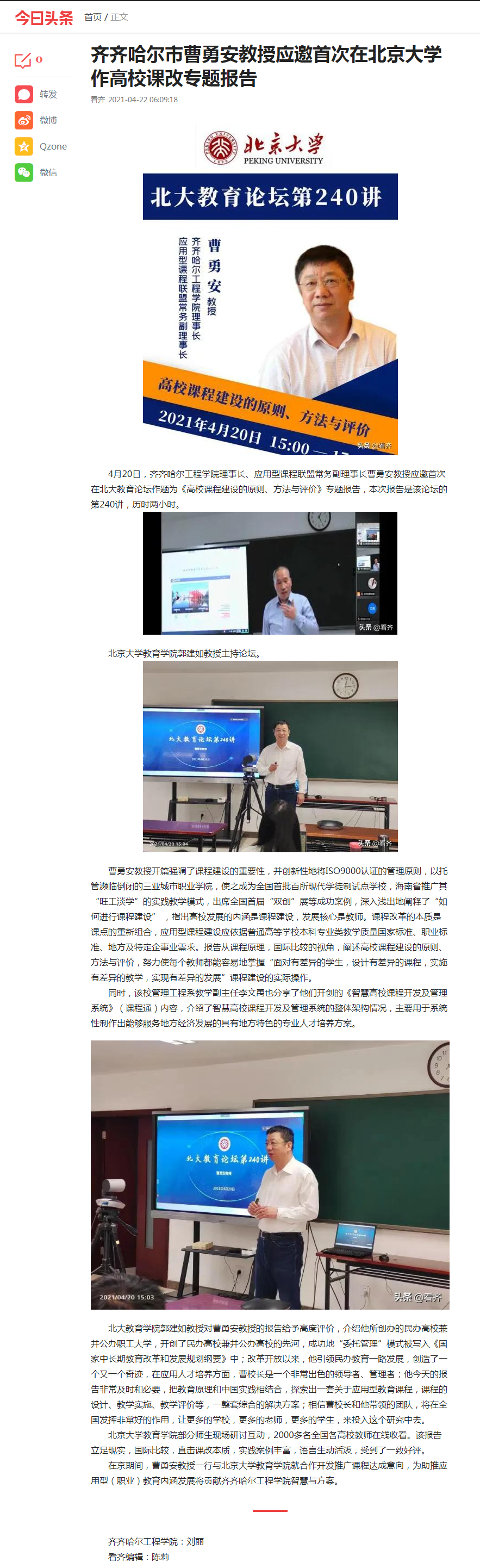 今日头条:齐齐哈尔市曹勇安教授应邀在北京大学作高校课改专题报告