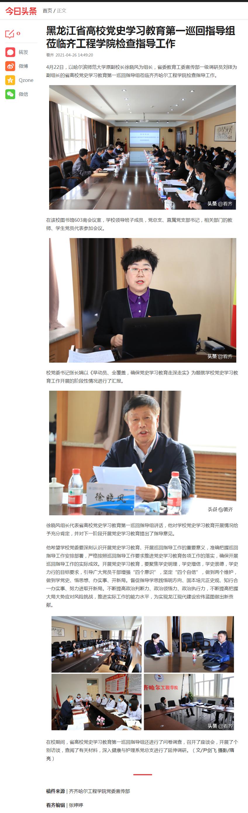 今日头条:黑龙江省高校党史学习教育第一巡回指导组莅临齐工程学院检查指导工作