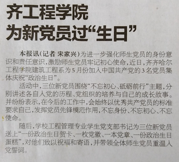 齐齐哈尔日报:齐工程学院为新党员过“生日”
