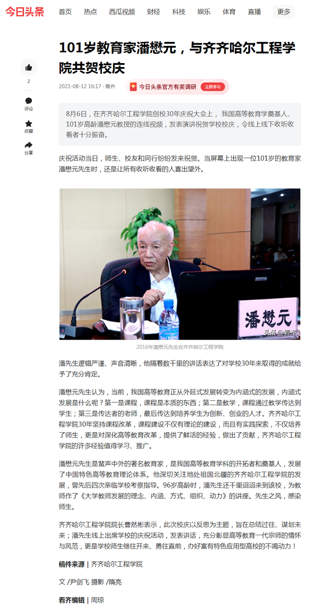 今日头条:101岁教育家潘懋元,与齐齐哈尔工程学院共贺校庆