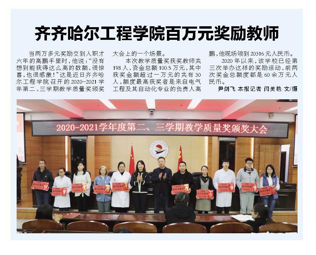 齐齐哈尔日报:齐齐哈尔工程学院百万元奖励教师