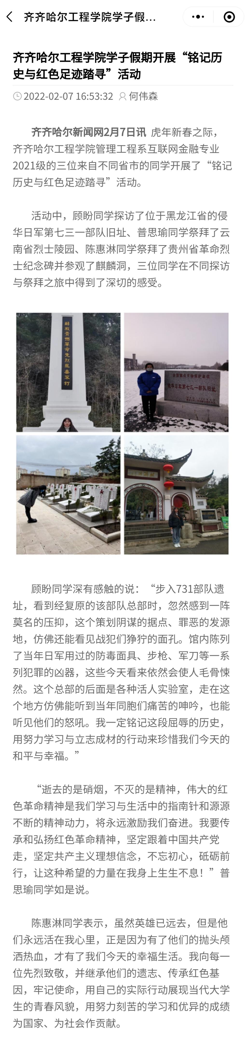 看齐▪本地新闻:齐齐哈尔工程学院学子假期开展“铭记历史与红色足迹踏寻”活动