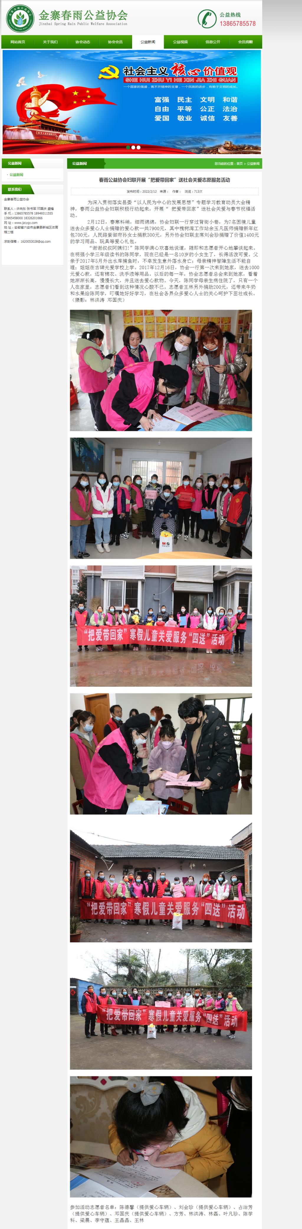 2月12日,学校建筑工程系土木212班梁晨同学参与了“春雨公益协会妇联”在安徽省六安市金寨县举办的“把爱带回家”寒假关爱儿童服务“四送”活动,当地媒体予以报道。