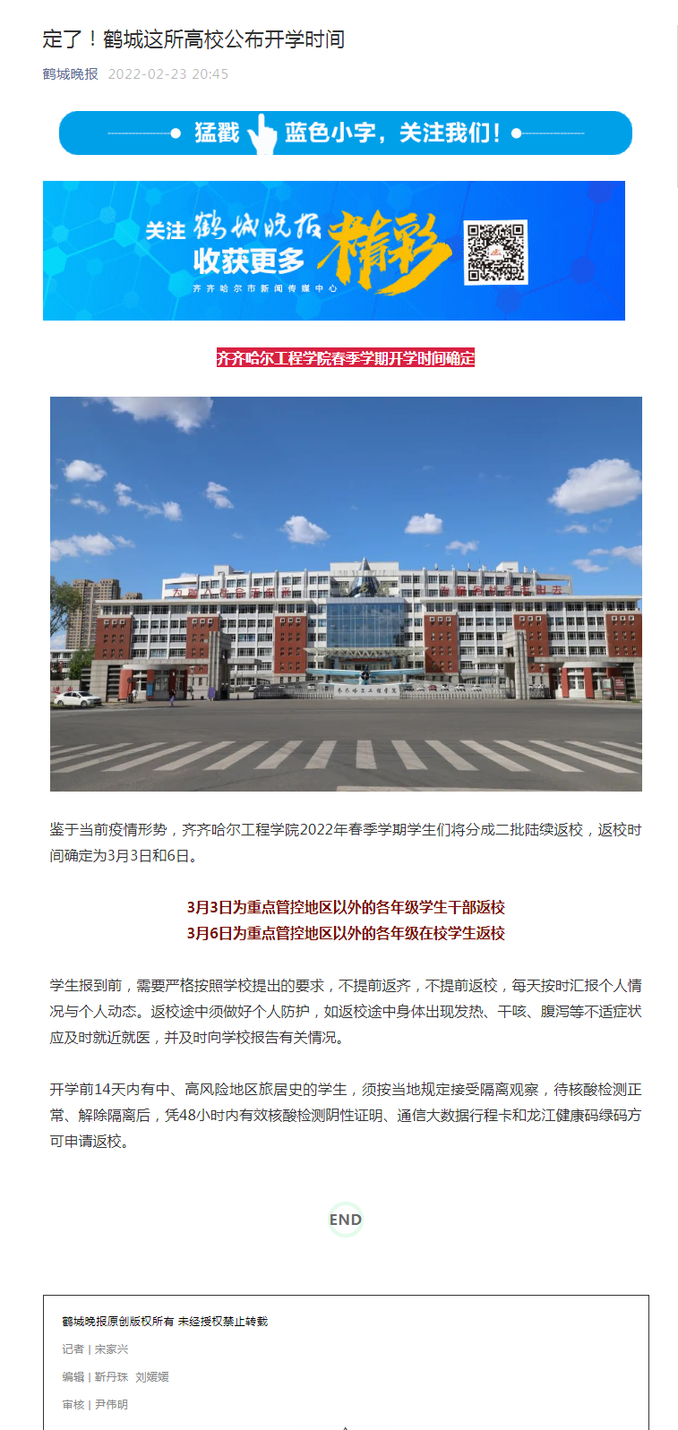 鹤城晚报:定了!鹤城这所高校公布开学时间