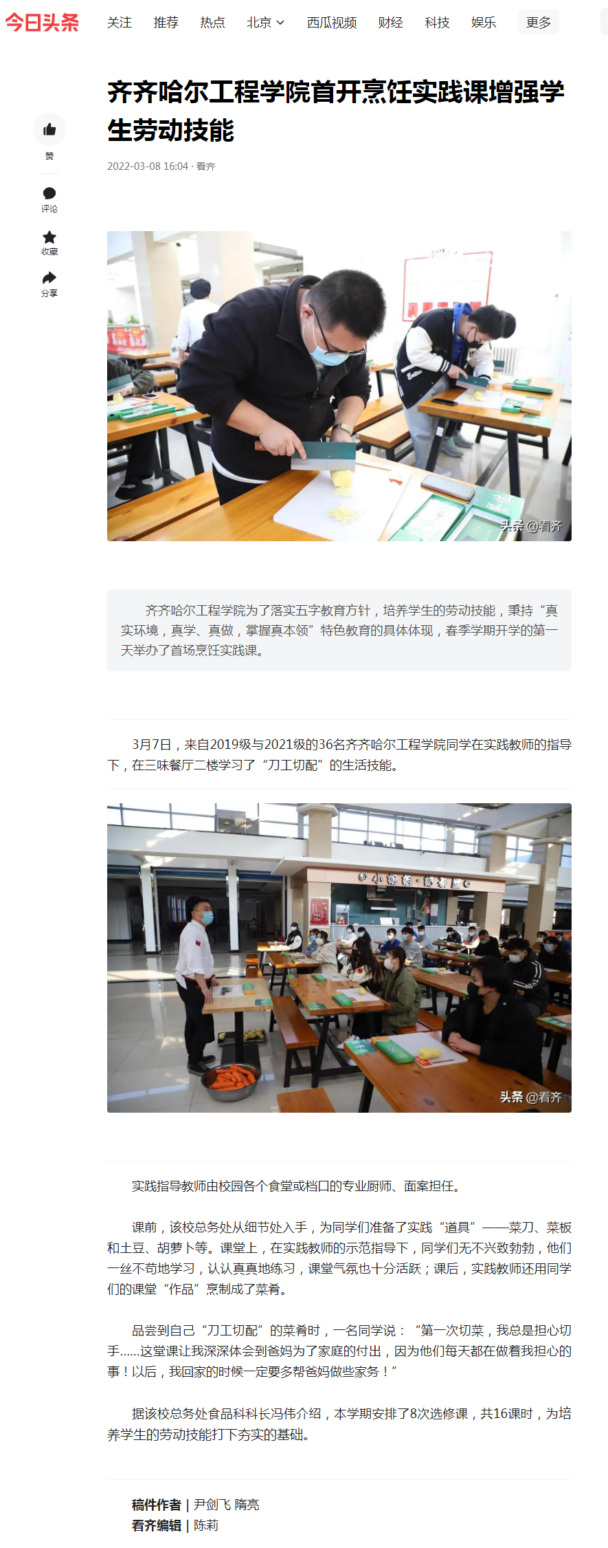今日头条:齐齐哈尔工程学院首开烹饪实践课增强学生劳动技能