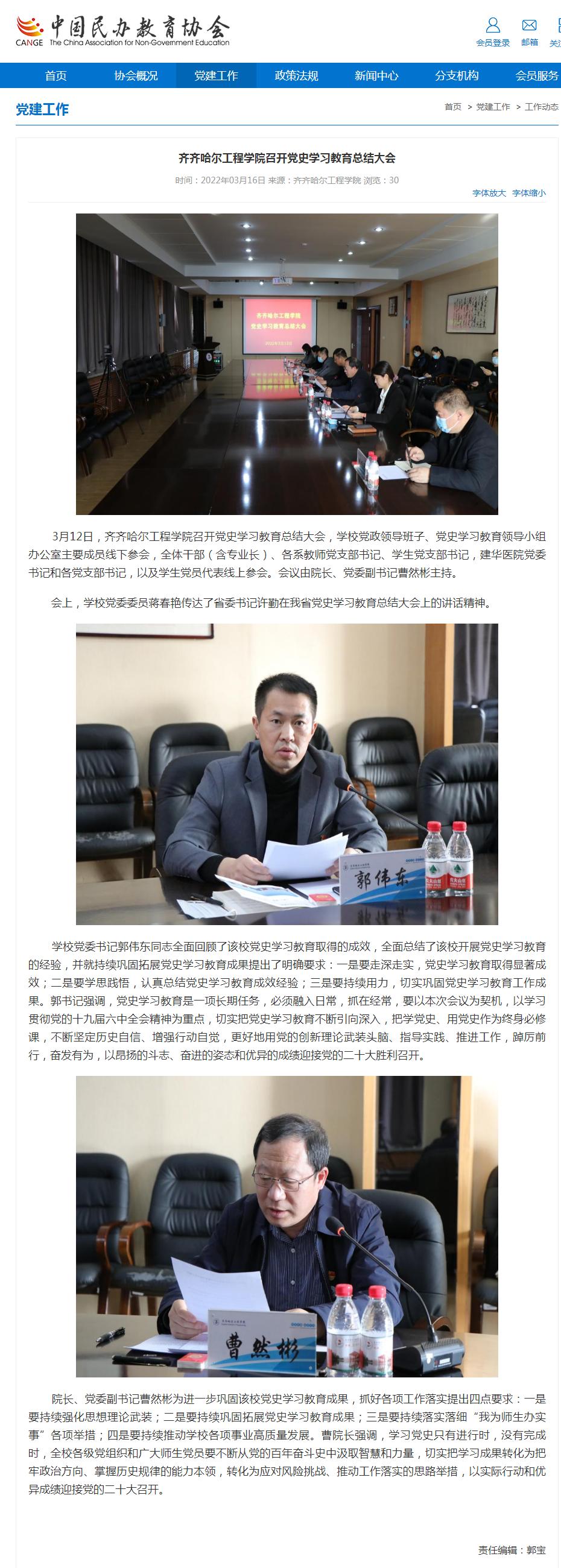 中国民办教育协会网:齐齐哈尔工程学院召开党史学习教育总结大会