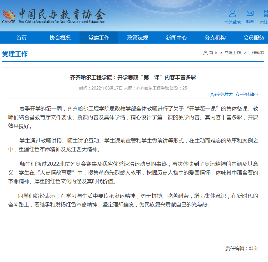 中国民办教育协会网:齐齐哈尔工程学院:开学思政“第一课”内容丰富多彩