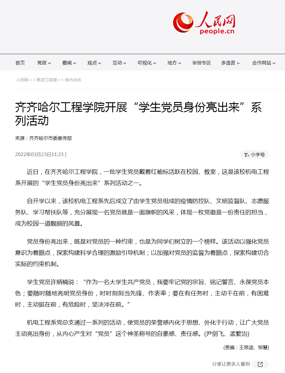 人民网:齐齐哈尔工程学院开展“学生党员身份亮出来”系列活动