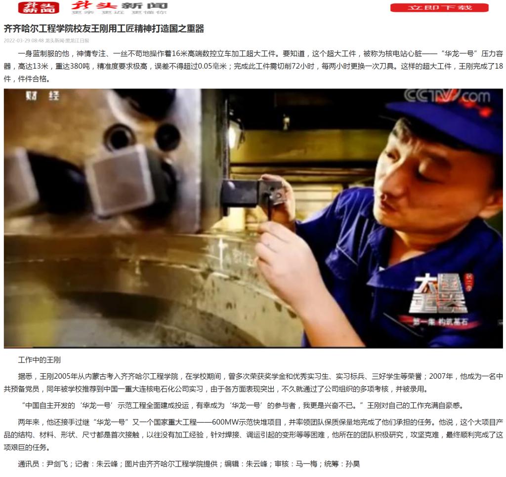 龙头新闻:齐齐哈尔工程学院校友王刚用工匠精神打造国之重器
