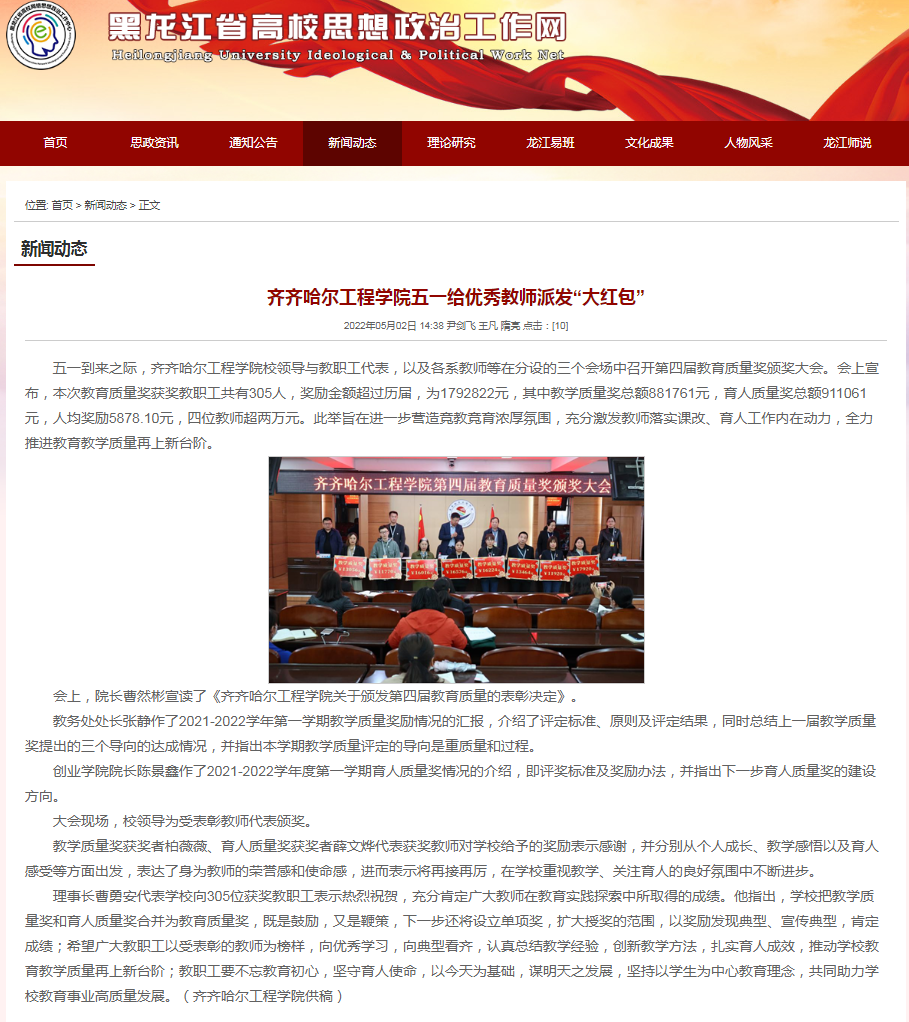 黑龙江省高校思想政治工作网:齐齐哈尔工程学院五一给优秀教师派发“大红包”