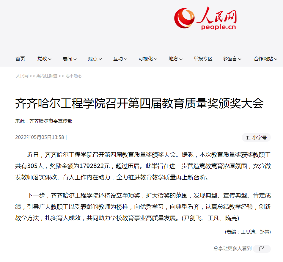 人民网:齐齐哈尔工程学院召开第四届教育质量奖颁奖大会