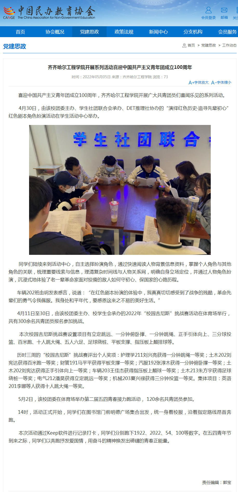 中国民办教育协会网:齐齐哈尔工程学院开展系列活动喜迎中国共产主义青年团成立100周年