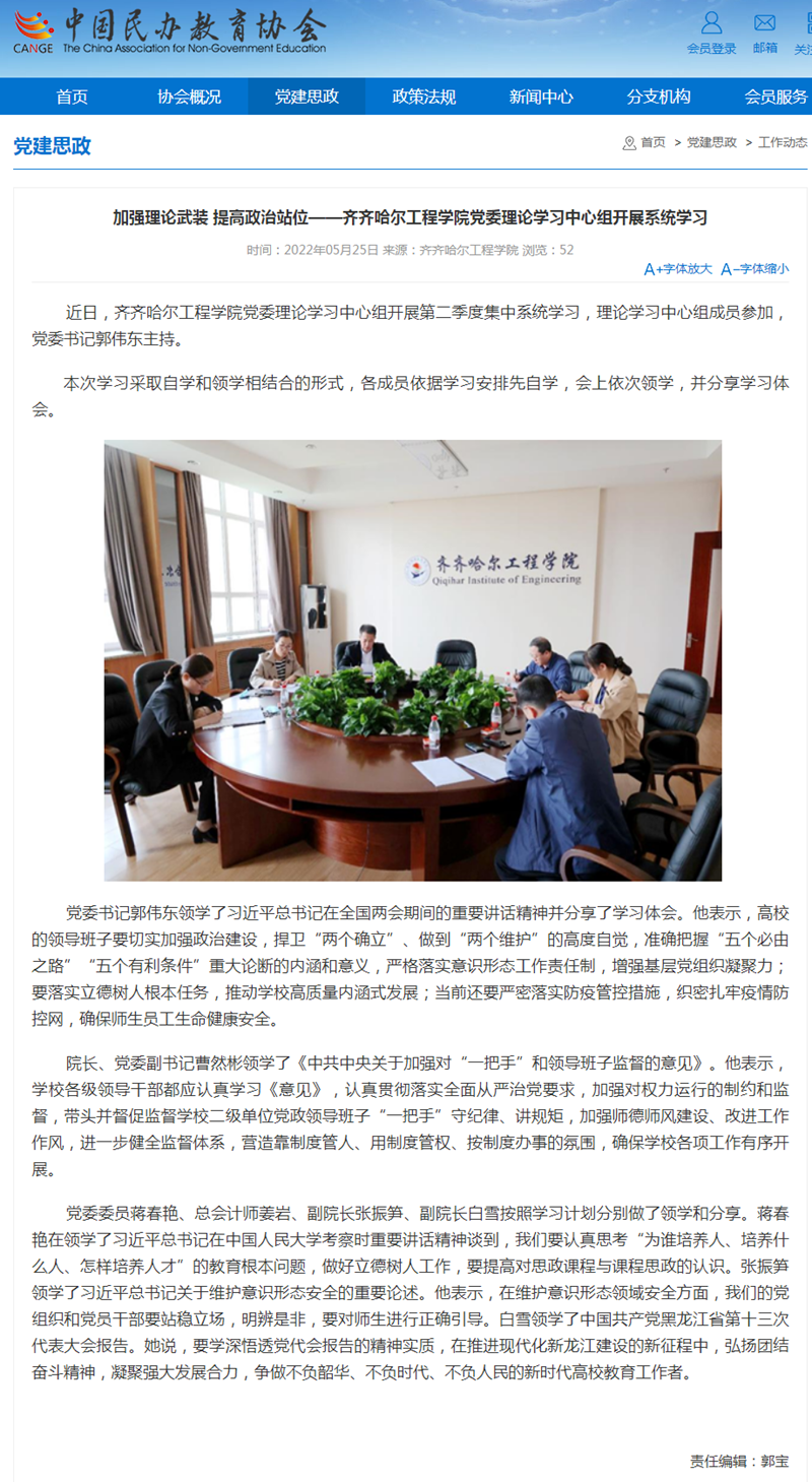 中国民办教育协会网:加强理论武装 提高政治站位——齐齐哈尔工程学院党委理论学习中心组开展系统学习