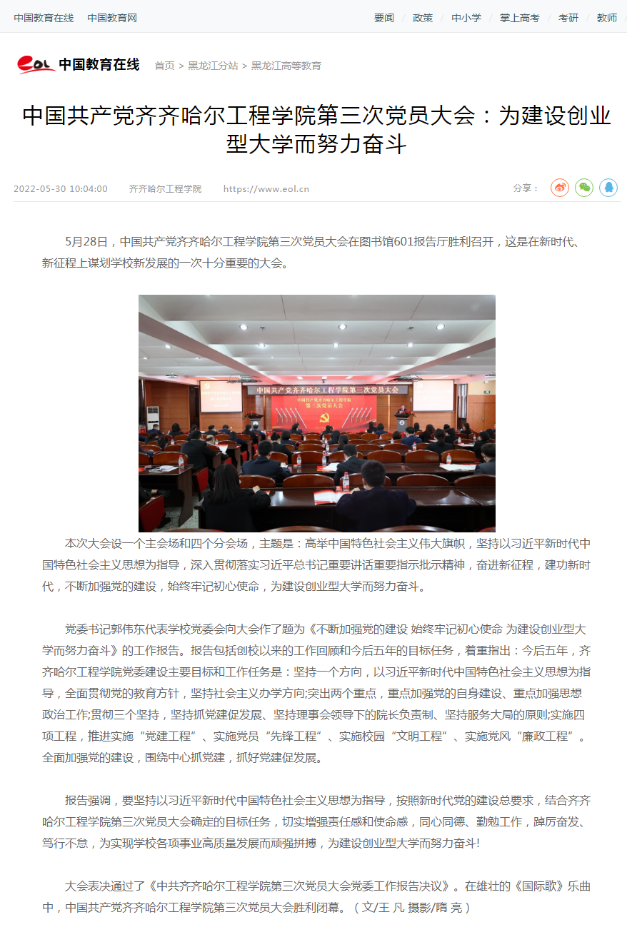 中国教育在线:中国共产党齐齐哈尔工程学院第三次党员大会:为建设创业型大学而努力奋斗