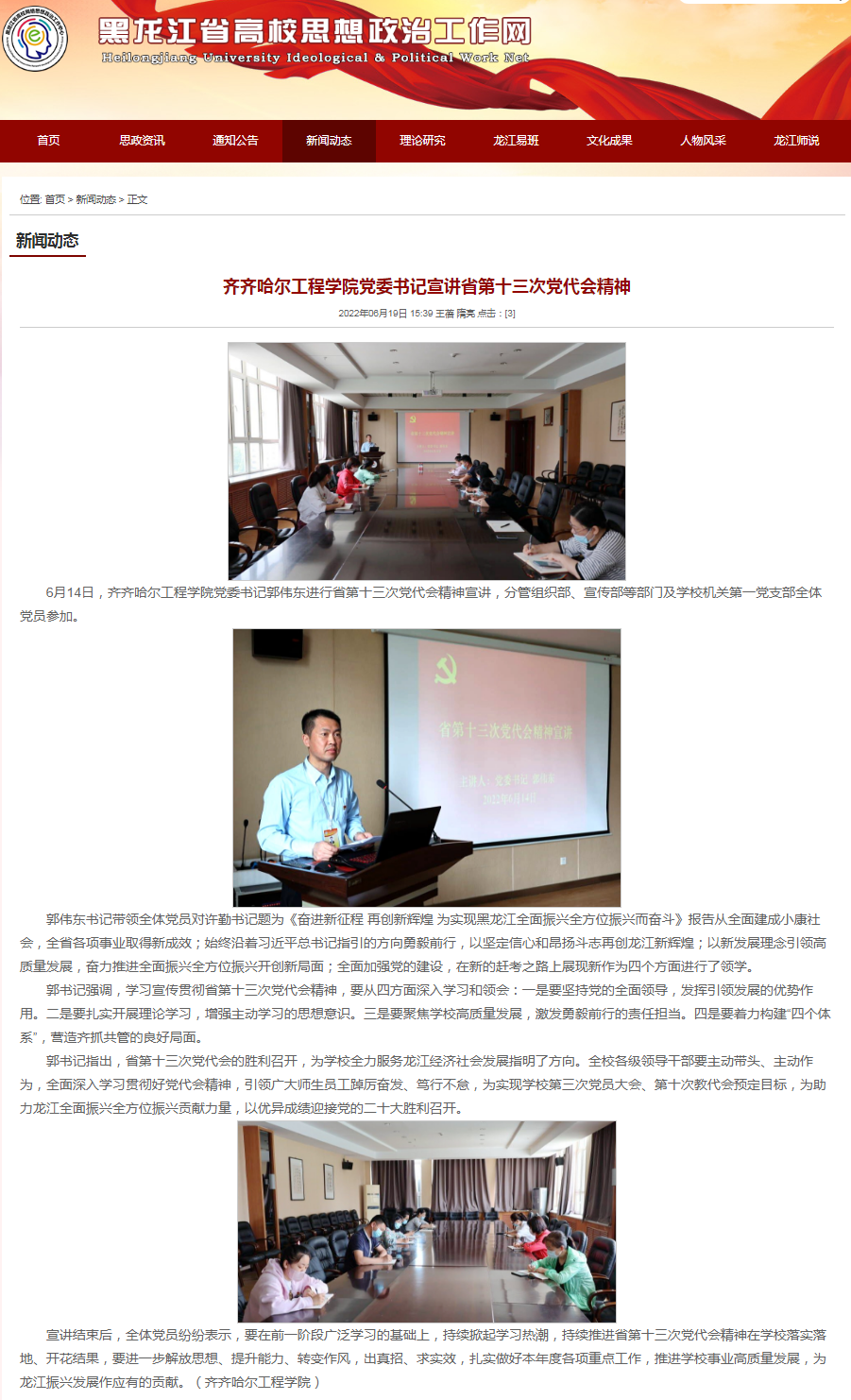黑龙江省高校思想政治工作网:齐齐哈尔工程学院党委书记宣讲省第十三次党代会精神
