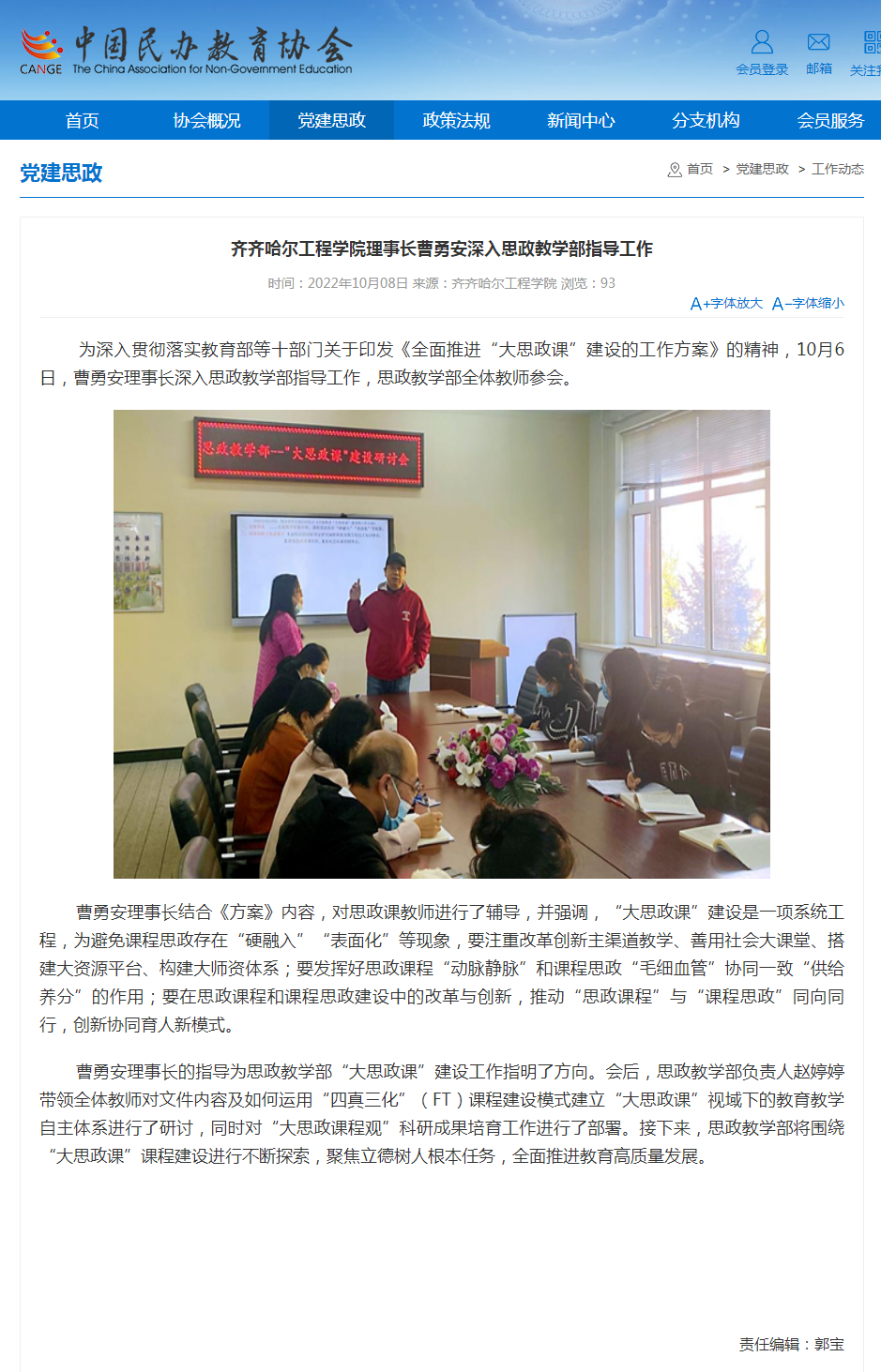 中国民办教育协会网:齐齐哈尔工程学院理事长曹勇安深入思政教学部指导工作