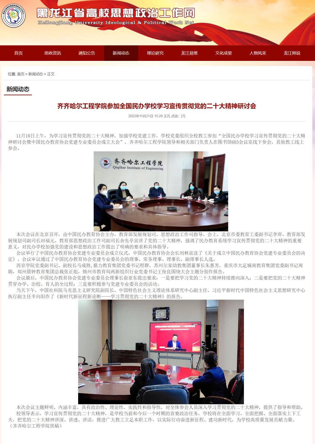 黑龙江省高校思想政治工作网:齐齐哈尔工程学院参加全国民办学校学习宣传贯彻党的二十大精神研讨会