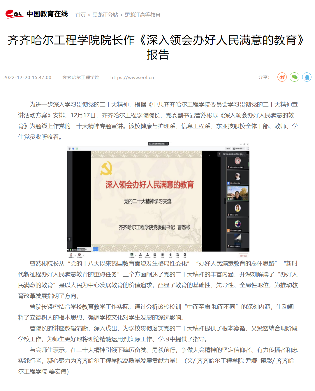 中国教育在线:齐齐哈尔工程学院院长作《深入领会办好人民满意的教育》报告