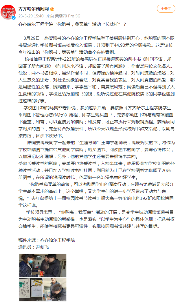 齐齐哈尔新闻网微博:齐齐哈尔工程学院“你购书,我买单”活动“长啥样”?